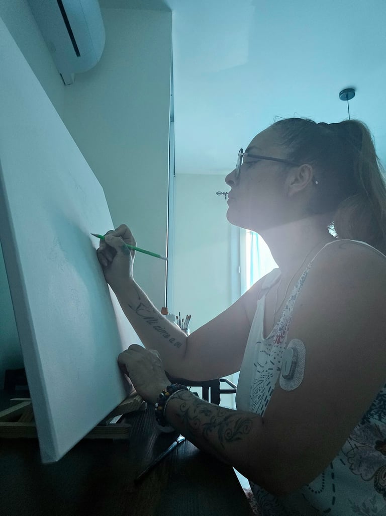 Ma rencontre avec la peinture est née dans un moment difficile : un arrêt de travail pour un cancer. Au fil des couleurs et des formes, j’ai trouvé un moyen d’apaiser la douleur et d’oublier la maladie. Ce qui était un soutien est devenu un amour durable et une passion.