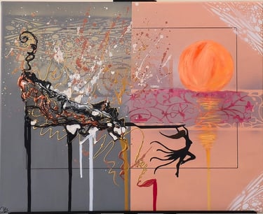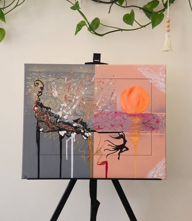 Voici « Danse au coucher de feu », une ode à la puissance de la lumière et au mouvement. Ce tableau captivant conjugue l’énergie brute d’un abstrait éclatant à la délicatesse de la silhouette qui s’élance vers le soleil.