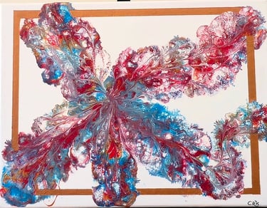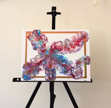 Découvrez « Danse des couleurs », une explosion visuelle et sensorielle où les pigments semblent s’élancer sur la toile telle une envolée de papillon. Au cœur d’un cadre épuré, les nuances de bleu, rouge, or et blanc s’entrelacent, formant des arabesques vibrantes et délicates.